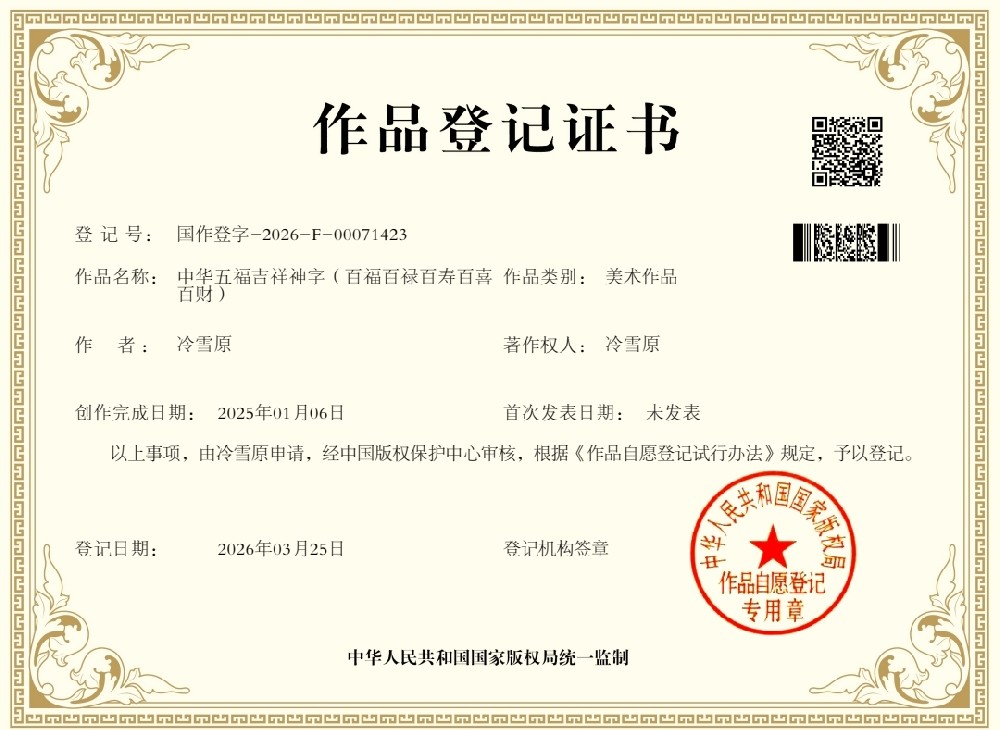 以此作品至诚祈愿:祖国繁荣富强,人民幸福安康,让中华美德与吉祥文化走进千家万户、深入人心、广受喜爱,成为传承民族精神、滋养时代心灵、助力民族复兴的时代佳作。